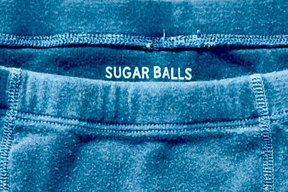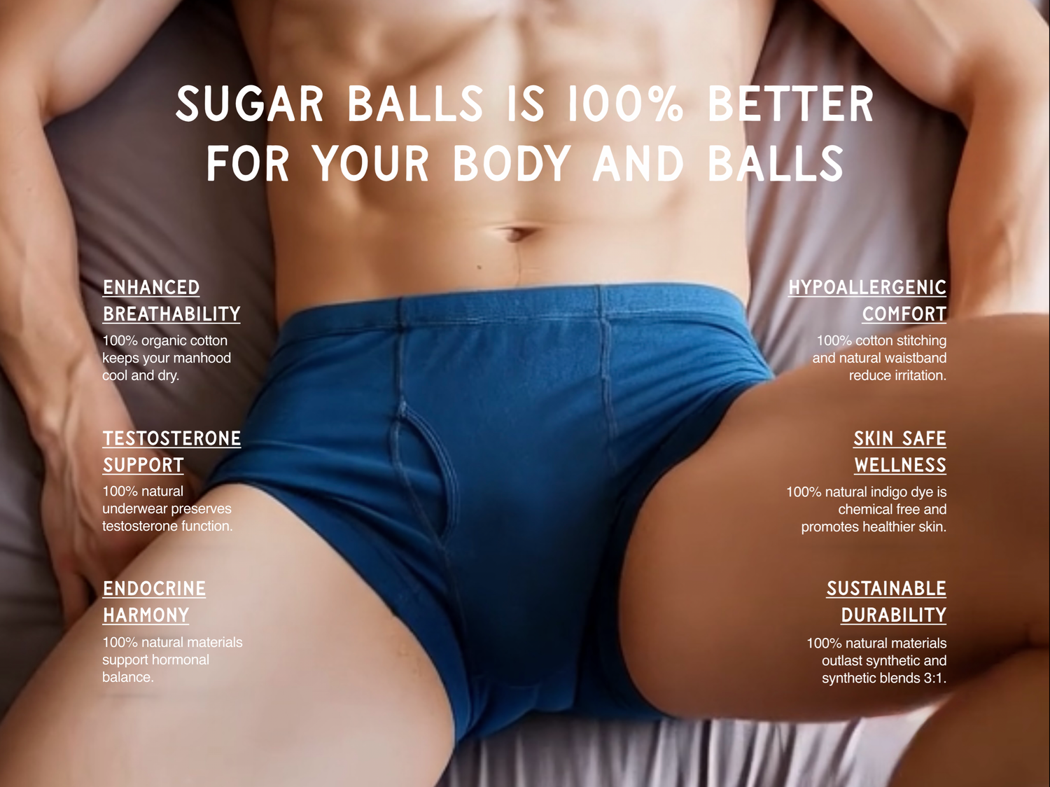 Sugar Balls is crafted exclusively with organic cotton, a natural latex and cotton woven waistband, cotton stitching and plant-based indigo dye, avoiding all synthetic fabrics like spandex or polyester for a healthier, breathable experience.